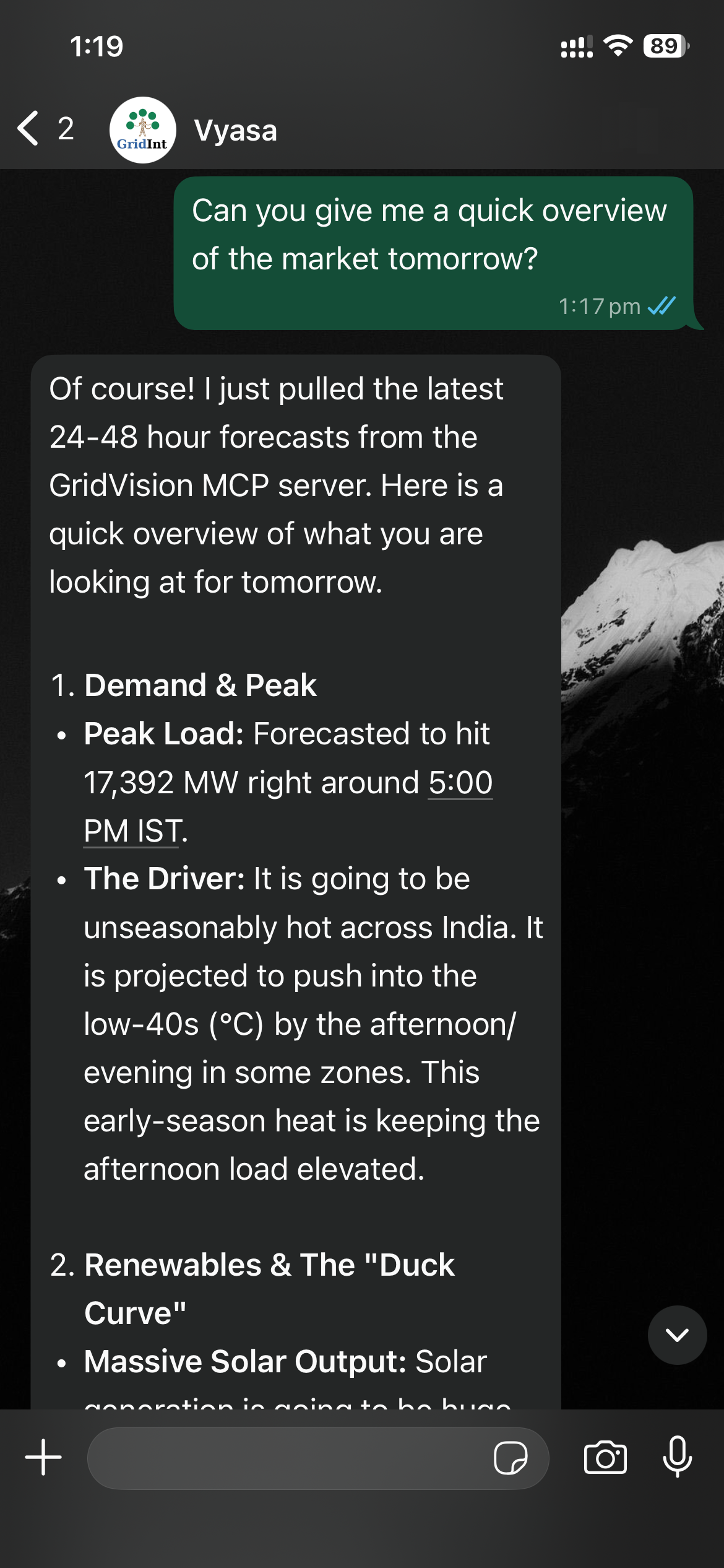 Chat with our AI agent Vyasa with encyclopedic knowledge of the Indian energy market using any messaging client to validate your findings